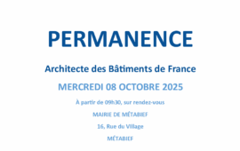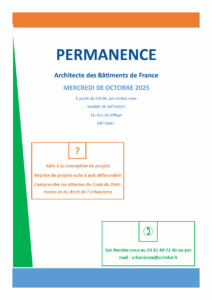- Publié le 4 octobre 2025Une permancence de l’Architecte des Bâtiments de France est prévue :